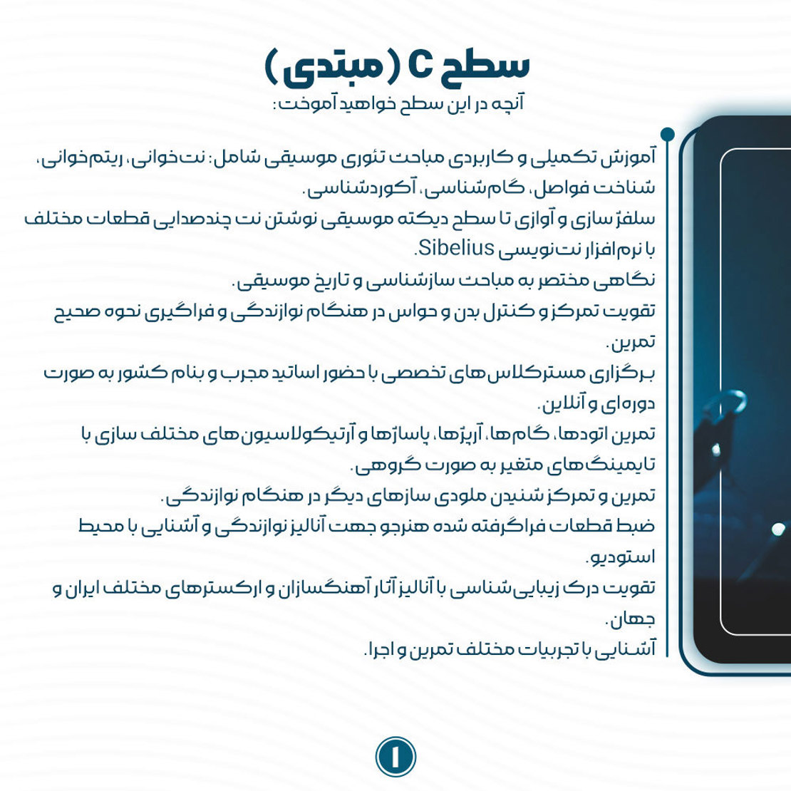 آموزش تکمیلی و کاربردی مباحث تئوری موسیقی شامل: نتخوانی، ریتمخوانی، شناخت فواصل، گامشناسی، آکوردشناسی.