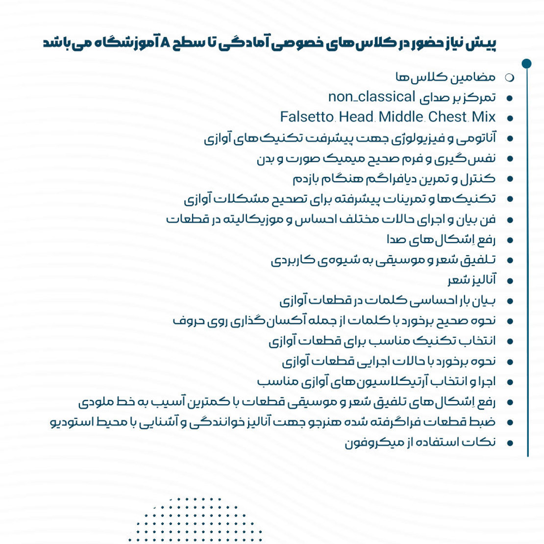 پیش نیاز حضور در کلاسهای خصوصی آمادگی تا سطح A آموزشگاه میباشد
