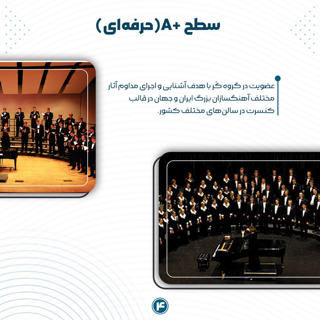 عضویت در گروه کُر با هدف آشنایی و اجرای مداوم آثار مختلف آهنگسازان بزرگ ایران و جهان در قالب کنسرت در سالنهای مختلف کشور.